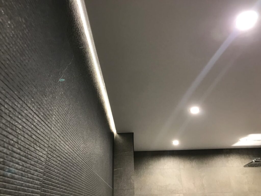- Система создаёт эффект «парящего» потолка за счёт сочетания зазора и подсветки.