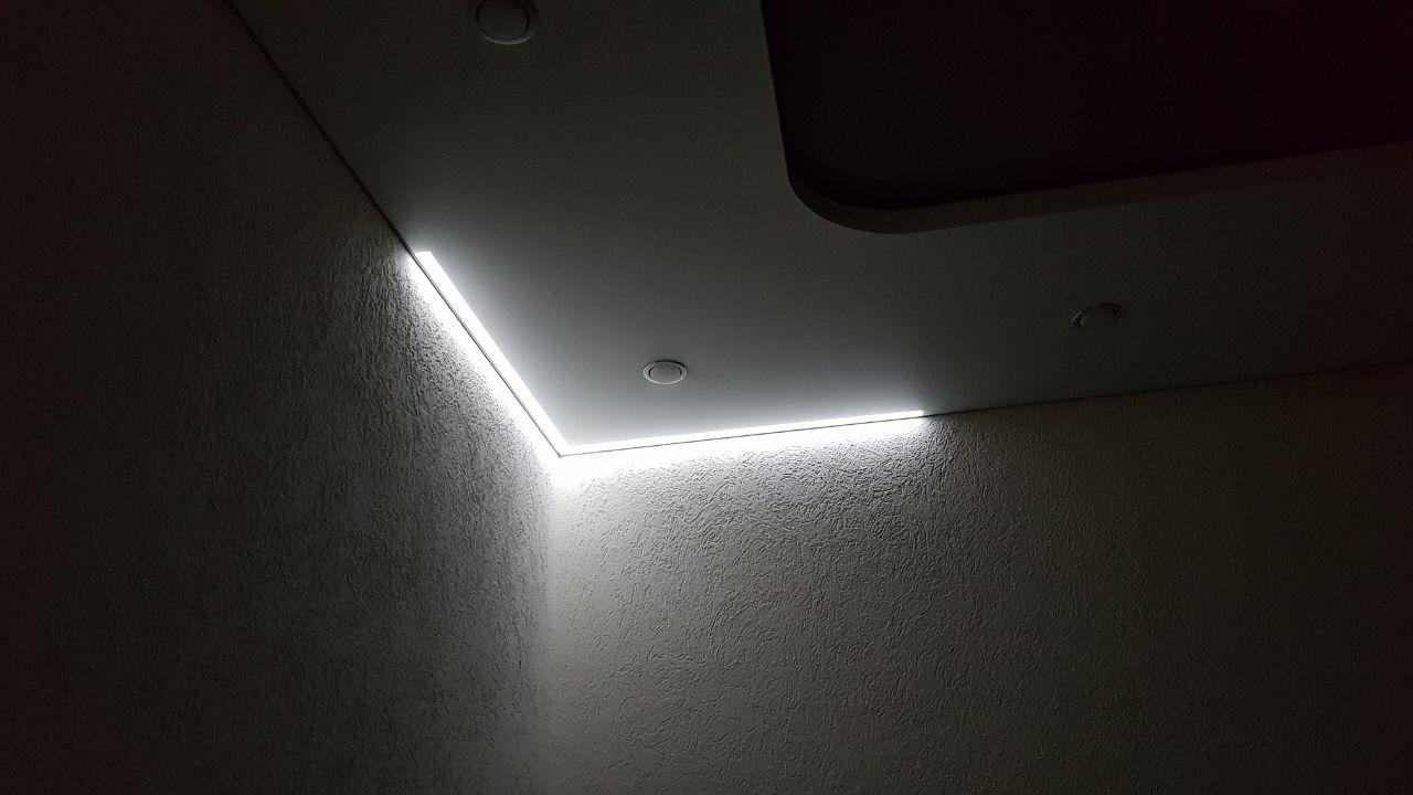 - Светодиодная лента размещается внутри профиля и подсвечивает контур мягким светом.