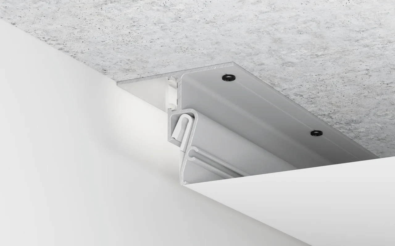Потолочный профиль крепится не к стенам, а к базовому потолку или другим горизонтальным основаниям. Он применяется, когда стены не позволяют обеспечить надёжное крепление: например, при слабой отделке, сложной архитектуре или необходимости задать определённый уровень потолка независимо от высоты стен.